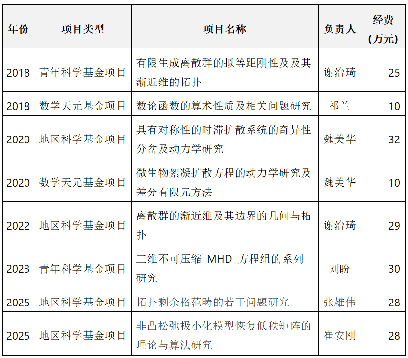 自2018年数学与交叉科学研究中心成立以来,中心教师累计承担国家自然科学基金项目8项,涵盖青年科学基金、地区科学基金、数学天元基金等多个类型,总经费近200万元,形成年均 1 项的稳定产出节奏。从早期青年项目的起步,到近年来地区基金、交叉学科的持续突破,体现了我中心科研实力的稳步提升和学科方向的不断拓展。尤其是近五年来,我中心教师在几何拓扑、偏微分方程定性理论与变分法、代数结构、算法优化、不确定性理论、图像处理等多个前沿领域取得了显著进展,逐步形成了特色鲜明、交叉融合的科研团队。